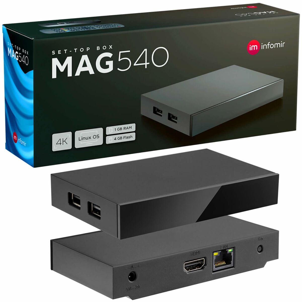 MAG540 is high performance 4K Linux Set Top Box MAG 540 is the next generation of MAG models and powered by a quad-core ARM Cortex-A35 CPU with a brand new Amlogic S905Y4-B chipset. This hardware makes the model much more powerful than previous STBs. The devices ensure easy and smooth playback of content in all popular modern video formats, including 4K. With MAG540, operators can provide a reliable service to their subscribers Interface continuity makes it easy to integrate the model into projects that have previously used MAG set-top boxes. Infomir can integrate set-top boxes with CAS/DRM and middleware at the operator’s request. For local and large streaming operators With MAG540/540w3, users can watch linear TV, video-on-demand and content from IPTV/OTT providers.1 In addition, the set-top box plays content within the local network and from external media. Operators can customise the device to offer users a tailored user interface and provide reliable technical support. Linux 4.9, Amlogic S905Y4-B chipset, infrared remote control, 4K and HEVC support, 1GB RAM, 4GB eMMC, HDMI 2.1 port, USB 2.0, 2.4GHz and 5GHz. This Internet TV Box can establish an Internet connection via the Ethernet interface at 100 Mbps. A network cable is required for the connection. Important to note: