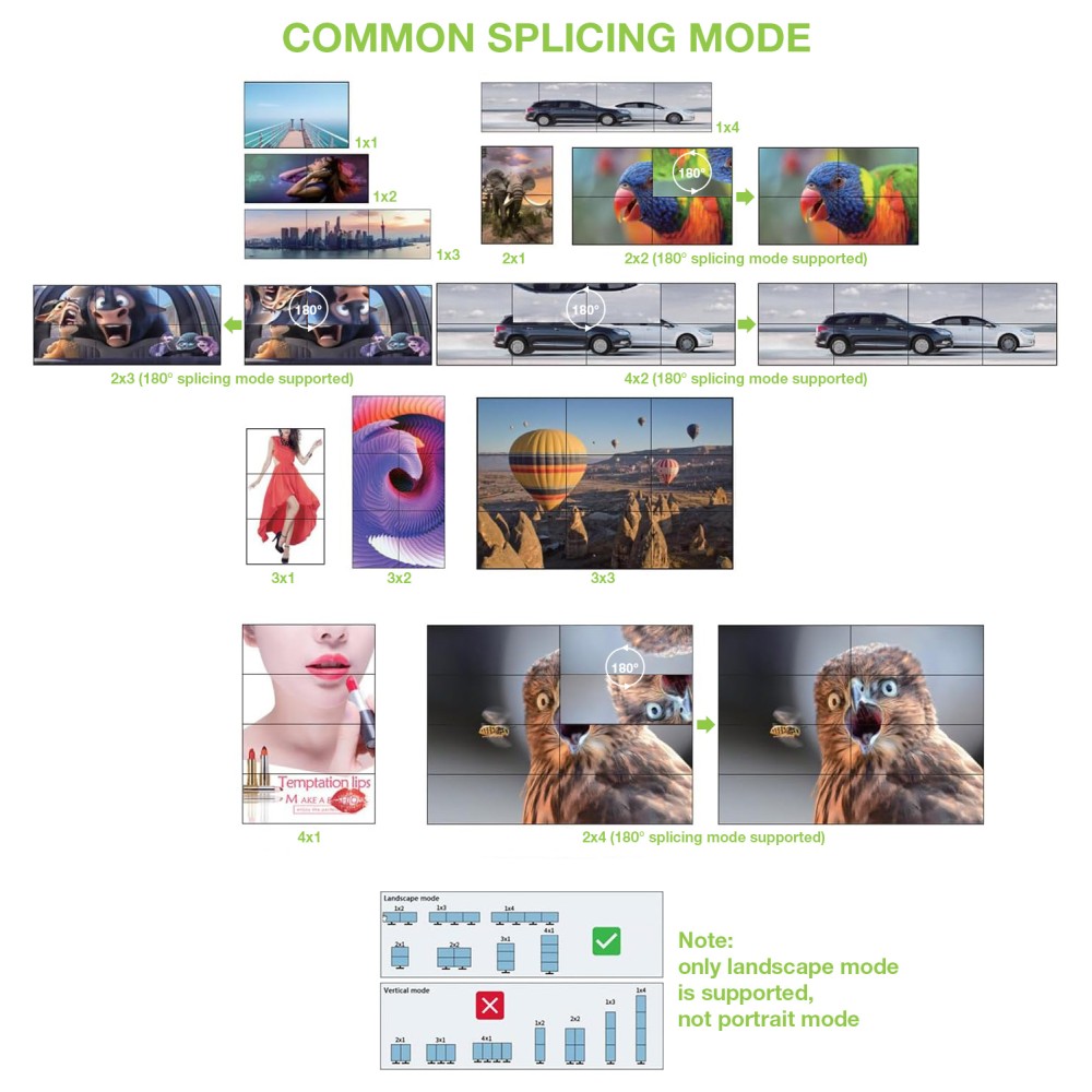 Supports a variety of display modes such as 1x2/1x3/1x4/2x2/2x3/3x2/2x4/4x2/3x3