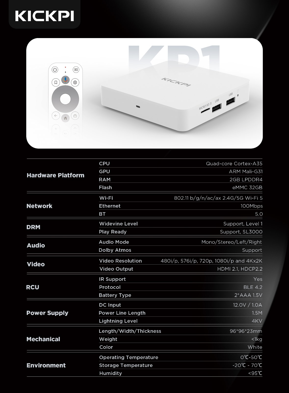 Το TV Box KICKPI KP1 Zehnder με επεξεργαστή Amlogic S905Y4 και μνήμη 2GB μπορεί να αποδώσει περιεχόμενο ανάλυσης 4K UHD.