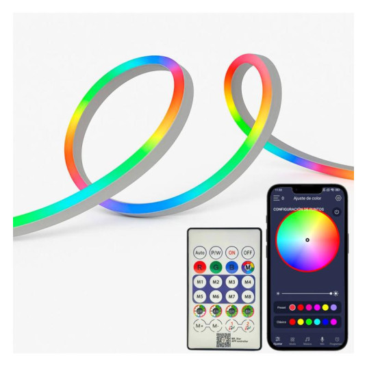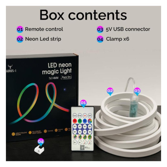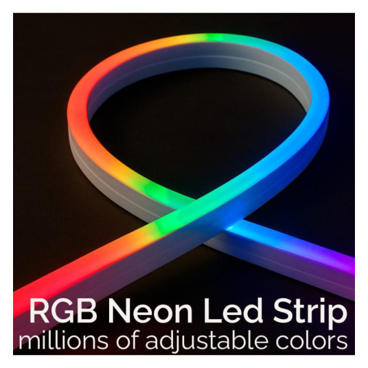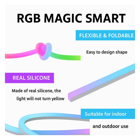 Neon LED RGB MAGIC FLEX SMART 7x14mm. Ιδανικό για να δημιουργήσετε την κατάλληλη ατμόσφαιρα και να διακοσμήσετε το σπίτι σας, Αυτό το σετ περιλαμβάνει 1 NEON LED FLEX 5 μέτρων, 1 τηλεχειριστήριο υπερύθρων και έναν προσαρμογέα ρεύματος με έξοδο USB 5V. Με εκατομμύρια προσαρμόσιμα χρώματα και δυναμικά εφέ, μπορείτε εύκολα να ελέγχετε τον φωτισμό μέσω του smartphone σας με την εφαρμογή ή το τηλεχειριστήριο που περιλαμβάνεται. Ανθεκτικό στο νερό (IP67), είναι ιδανικό για εσωτερική και εξωτερική χρήση. Δημιουργήστε μοναδικές και ζωντανές ατμόσφαιρες με ένα μόνο άγγιγμα!